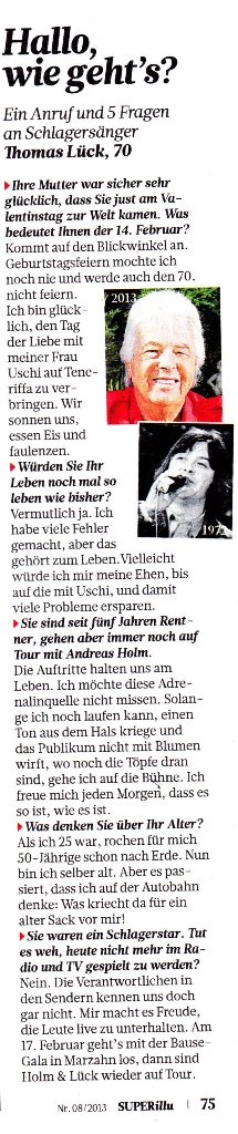 Der Artikel in der Superillu “Hallo wie geht’s” am 14.02.2013, also direkt an Thommys Geburtstag, fiel sehr spärlich aus. Den 70. Geburtstag eines bekannten und auch heute noch sehr beliebten Sängers so wenig zu würdigen, darüber waren wir Fans sehr enttäuscht. Der Artikel “Flucht in die Sonne” in der “Neuen Welt” vom 06.02.2013 dagegen ist sehr ansprechend und nett geschrieben. Darüber haben wir uns riesig gefreut.