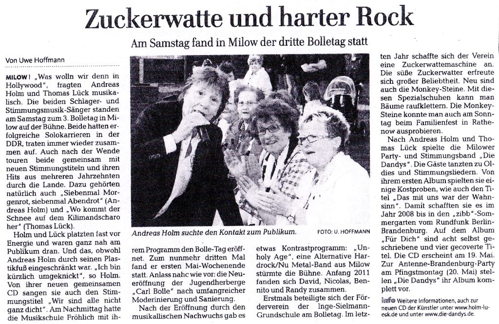 Inzwischen standen die “Dandys”, eine Partyband aus Milow, schon in den Startlöchern. Hartmut und Antje hatten sich schon am Nachmittag zu uns gesellt und Hartmut war es auch, der den Auftritt für Andreas und Thomas organisiert hatte. Sie erzählten uns, dass sie im Ort wohnen, ihr Tonstudio gleich um die Ecke haben und dass am 19. Mai ihr neues Album erscheint.